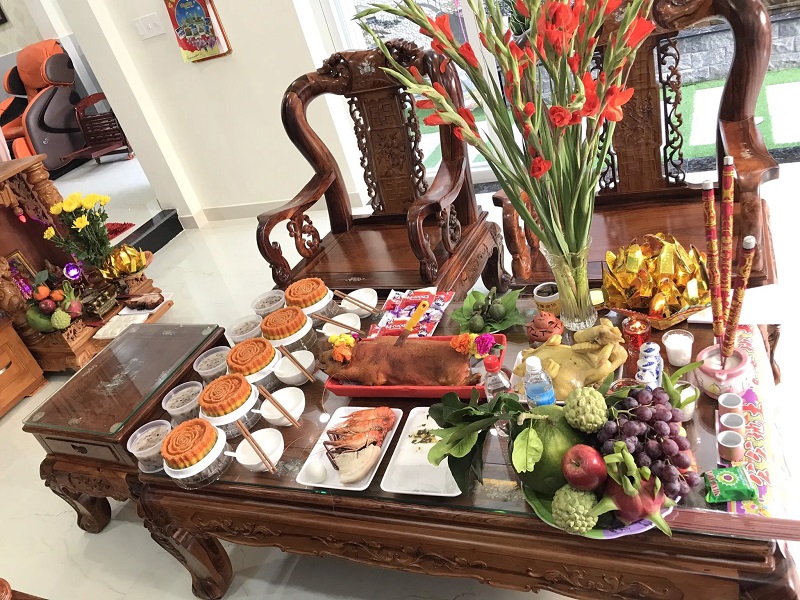 - Mâm cúng đặt ngay ngắn trên bàn thờ.
